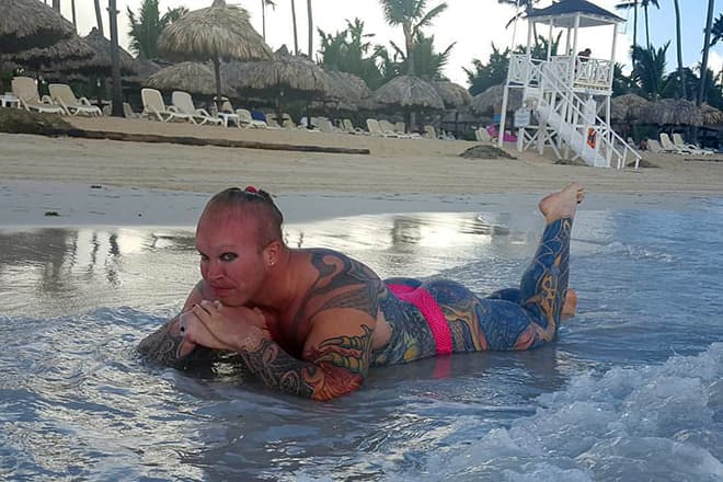 Тело спортсмена украшают татуировки на правой руке, правой стороне грудной клетки и на обеих бедрах.