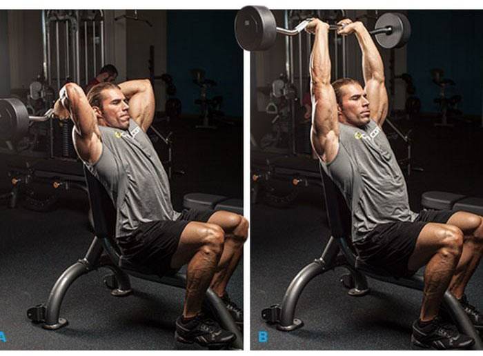 То же упражнение стоя или сидя со штангой развивает длинный и латеральный пучки трицепса.