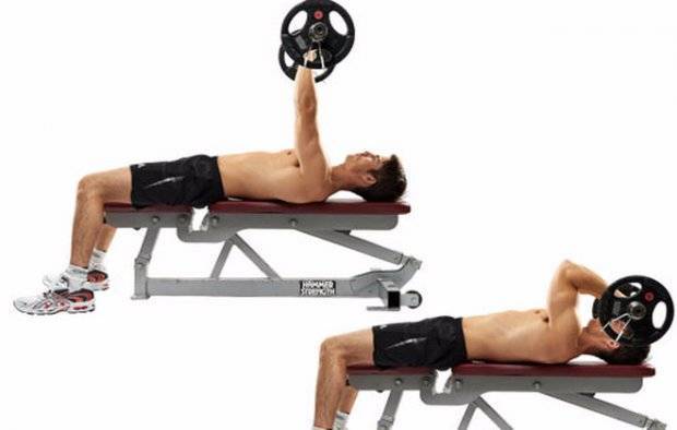 Из разных положений, например, из положения лежа на спине, необходимо поднять штангу на вытянутых руках. Следует следить за плечами: они должны оставаться на скамье, сгибаются только руки в локтевых суставах.