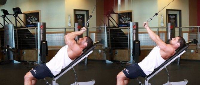- придайте скамье угол наклона примерно 45° и разместите её перед верхним блоком кроссовера;