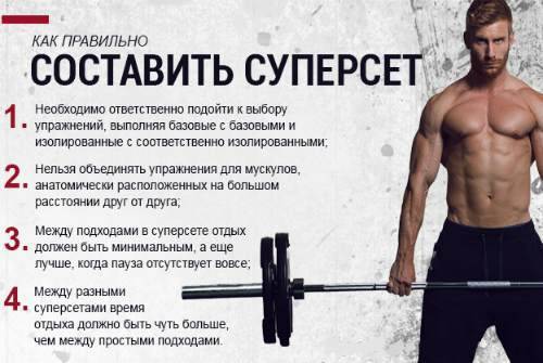 - Суперсеты ― по силам только опытным качкам, но всё же делайте их, они заставят буквально взорваться и ныть вашу мускулатуру.