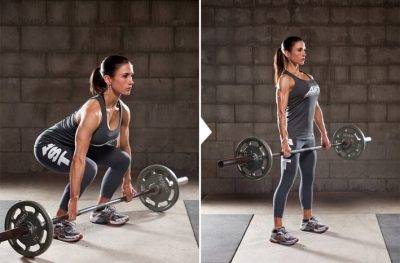 - Становая тяга (нагрузка практически на все тело + ноги (бедра, бицепсы, квадрицепсы) + ягодицы (попа) + руки (предплечья и бицепсы) +мышцы спины +брюшной пресс).