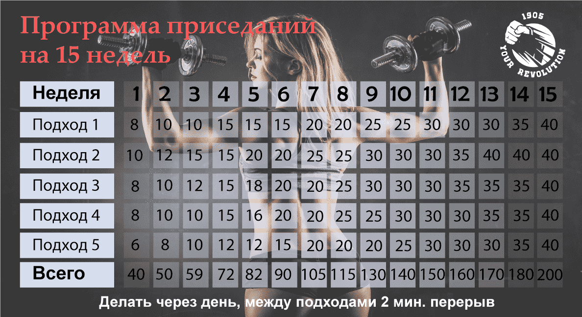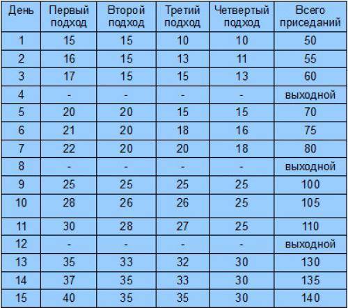 Необходимо выполнять по 4 подхода в день. Между каждым подходом должен быть перерыв не менее минуты. С каждым днем количество приседаний увеличивается. Каждый четвертый день делается перерыв, для того, чтобы дать мышцам отдохнуть.