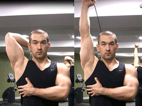 Для его выполнения необходимо встать спиной к тренажеру. Направив ладони вверх, согните руки в локтевом суставе и возьмитесь за рукоять блока. Разверните руки так, чтобы плечевая ось и предплечье были параллельны. Старайтесь держать локти как можно ближе к голове. Из исходного положения начинайте распрямлять руки полностью, при этом, не отводя локти в сторону, а зафиксировав их. Затем вернитесь в первоначальную позицию.