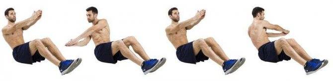- Ноги надо оторвать от пола и начать выполнять русский твист, посредством скручиваний корпуса с руками в разные стороны.