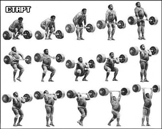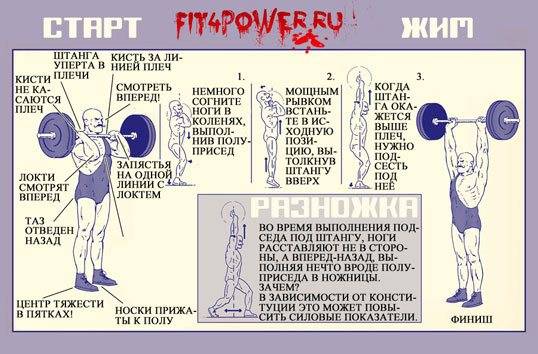 1) Становитесь в исходную позицию, как в классической становой тяге, только носки смотрят в стороны, а штангу берете в замок, то есть, накрывайте остальными пальцами большой палец. 2) Начинаете «выполнять» становую тягу, но, когда штанга оказывается над коленом, начинается подрыв, как в подъемах штанги на грудь. 3) Выполняя подрыв, Вы одновременно выходите на носки и подтягиваете штангу трапецией, подбивая её ногами вверх и выполняя протяжку, и в точке, когда штанга максимально высоко, Вы её подкидываете вверх, «освобождаясь от неё» и одновременно под неё подсаживаетесь, в общем, выполняете подъем штанги на грудь. 4) Когда штанга у Вас на груди, Вы чуть подсаживаетесь, и выталкиваете её вверх, как во время выполнения армейского жима, но после того, как штанга пересекает линию глаз, под неё необходимо подсесть. 5) Подсед выполняется или в качестве швунга, или в качестве разножки в ножницы, что каждый атлет для себя решает индивидуально, поскольку в зависимости от конституции каждому удобнее выполнять толчок по-своему.