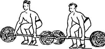 Итак, сначала штанга движется вверх вследствие усилий мышц, разгибающих голеностопные и коленные суставы. Голова по отношению к туловищу не меняет своего первоначального положения. В процессе тяги мышцы рук находятся в сильно натянутом, но не напряженном состоянии. Усилия от мышц ног к грифу доходят с меньшими потерями, если стопы ног фиксированы по отношению к помосту, опора жесткая, вес тела и штанги до конца подрыва распределяется равномерно на обе ноги, линия тяжести проходит через середину площади опоры, давление груза ощущается на подошвенной поверхности ступней от пальцев до пяток, руки прямые, их мышцы и мышцы плечевого пояса натянуты весом штанги. На всем пути подъема штанги вверх тяжелоатлет ногами активно взаимодействует с помостом, отталкивается от него. Относительная величина опорной реакции (в процентах от поднимаемого веса штанги) уменьшается с утяжелением снаряда (от 60 до 100 процентов) у кандидатов в мастера спорта с 187 до 147 процентов и у спортсменов младших разрядов — с 215 до 166 процентов (В.А.Сальников, А.И.Фаламеев, Б.В.Кимейша).