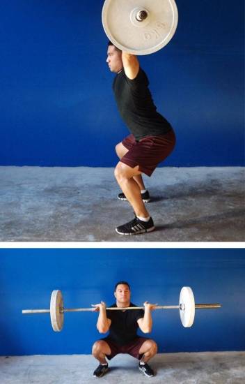 Когда штанга окажется на уровне солнечного сплетения, начинаем под нее подседать, при этом заводя её движением плеч на грудь. Если все выполнено правильно, примерно на середине подседа, штанга должна «упасть» Вам на грудь. Садимся с ней на груди в полную амплитуду, встаем и фиксируемся. У нас есть пара секунд для того, чтобы собраться с силами и подготовиться к выталкиванию. Во время толчка штанги локти следует держать развернуто друг от друга таким образом, чтобы штанга лежала у вас не на груди, а на плечах.