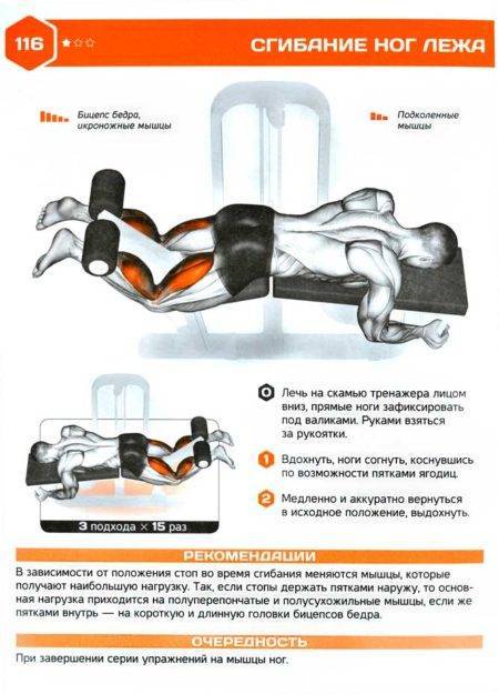 - Сгибание ног лежа является завершающим упражнением в тренировке мышц бедра (в частности, бицепса), так как формирует рельеф и укрепляет мышечный каркас, а не наращивает массу.