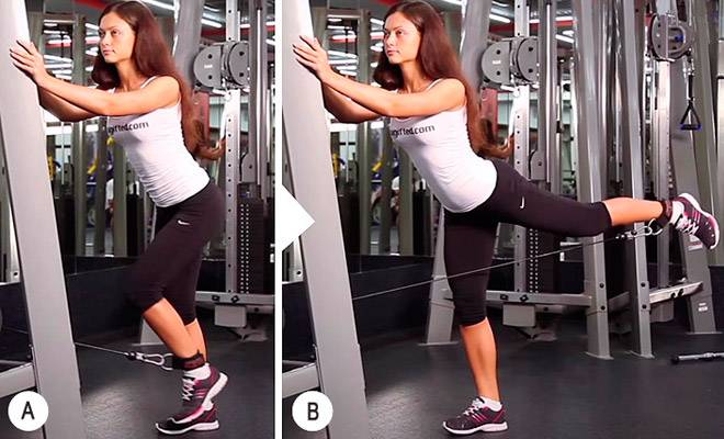 Нужно подойти к нижнему блоку тренажера и установить необходимый вес отягощения. Встаем боком к тренажеру. Одеваем манжету на лодыжку.